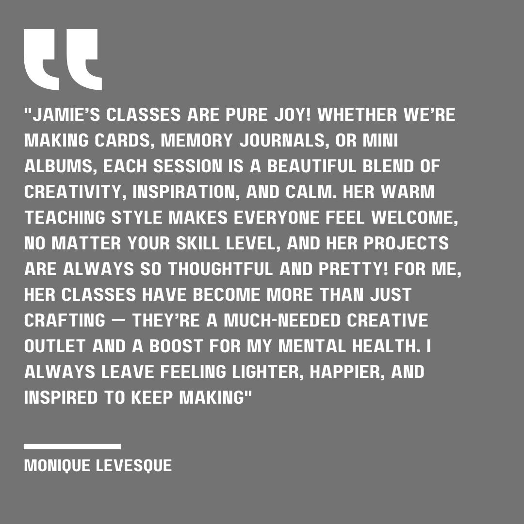 "I have taken a lot of mini album and other “crafty”classes, and I absolutely love the classes by Jamie! She is such a great teacher and her love for all things paper shows in all of her classes and videos.."