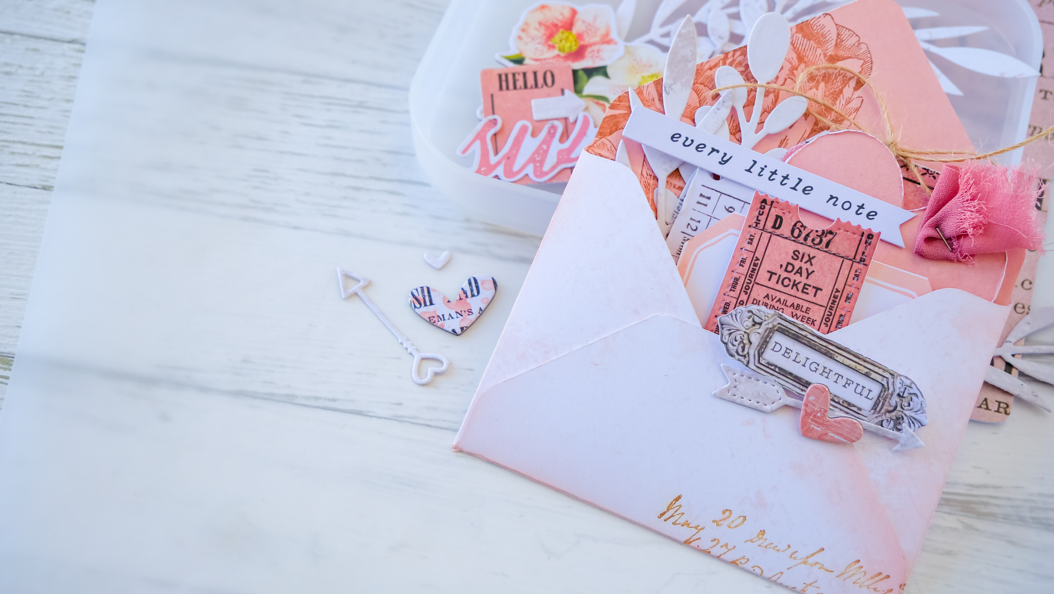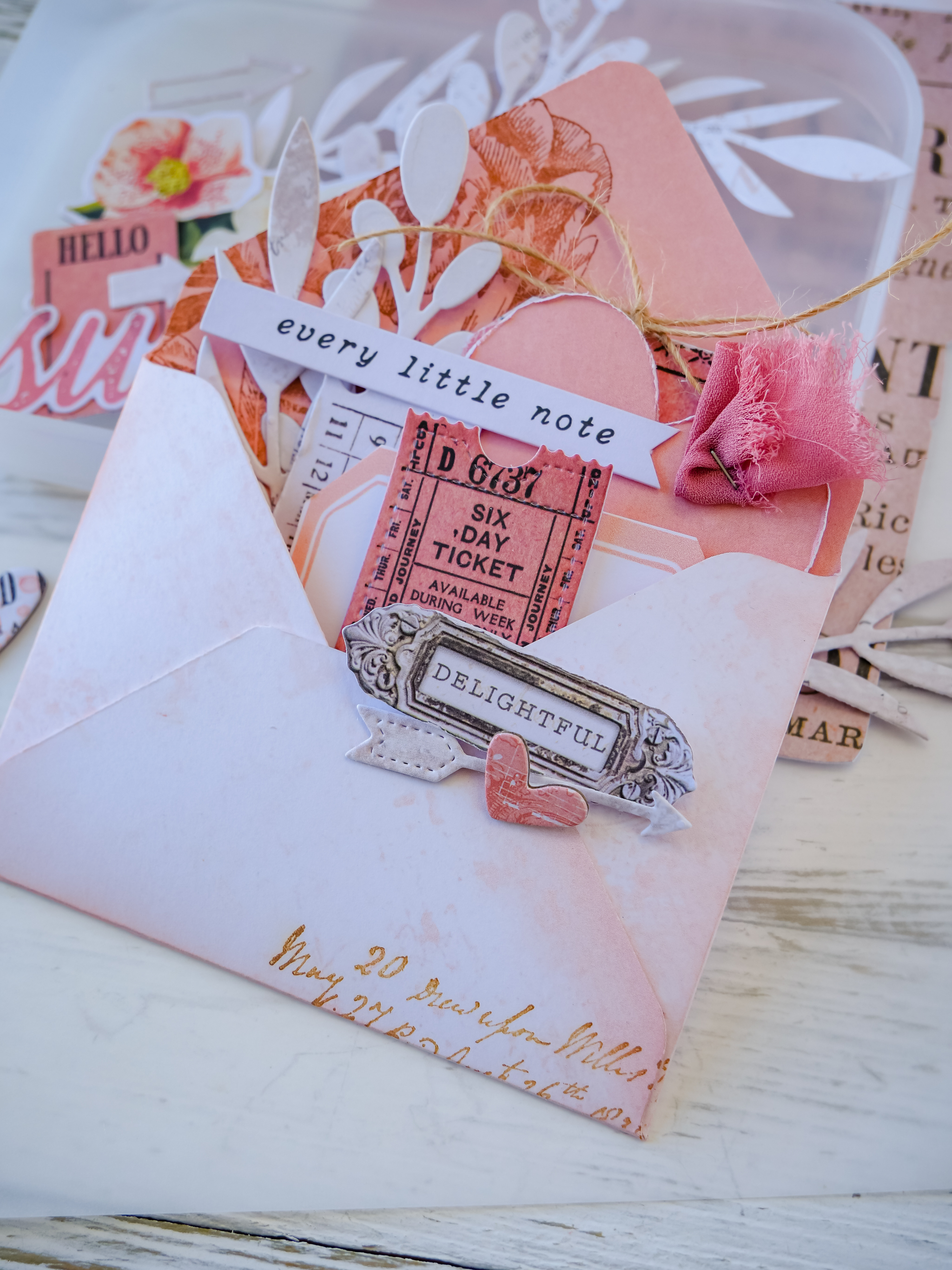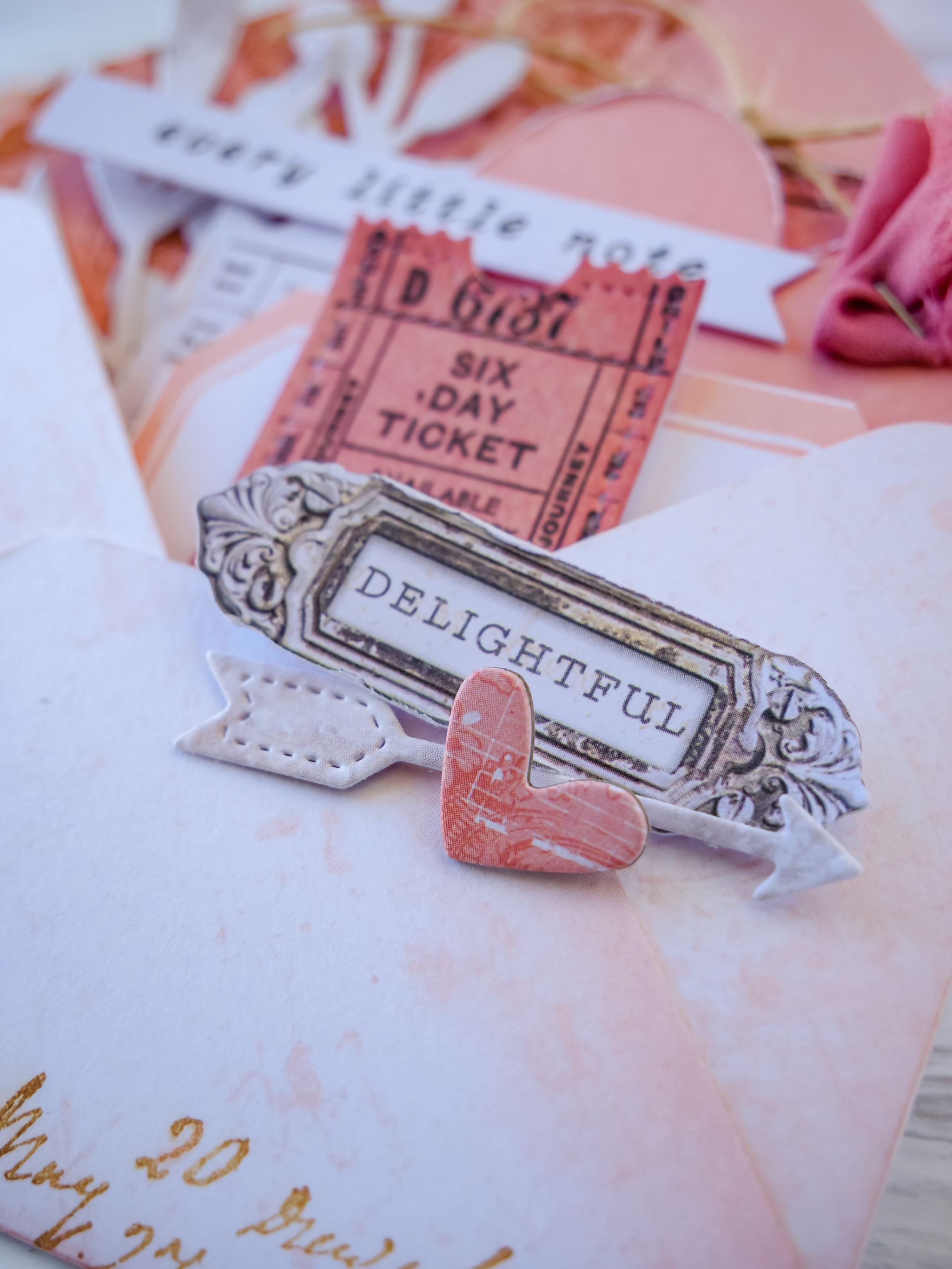In the spirit of Favorite Things, we must include an embellished envelope. Calling this one a Tucked Heart Envelope because…we will be tucking a heart in with all the other layers and ephemera and what nots. Be sure and download the printable so you too can have a heart to tuck