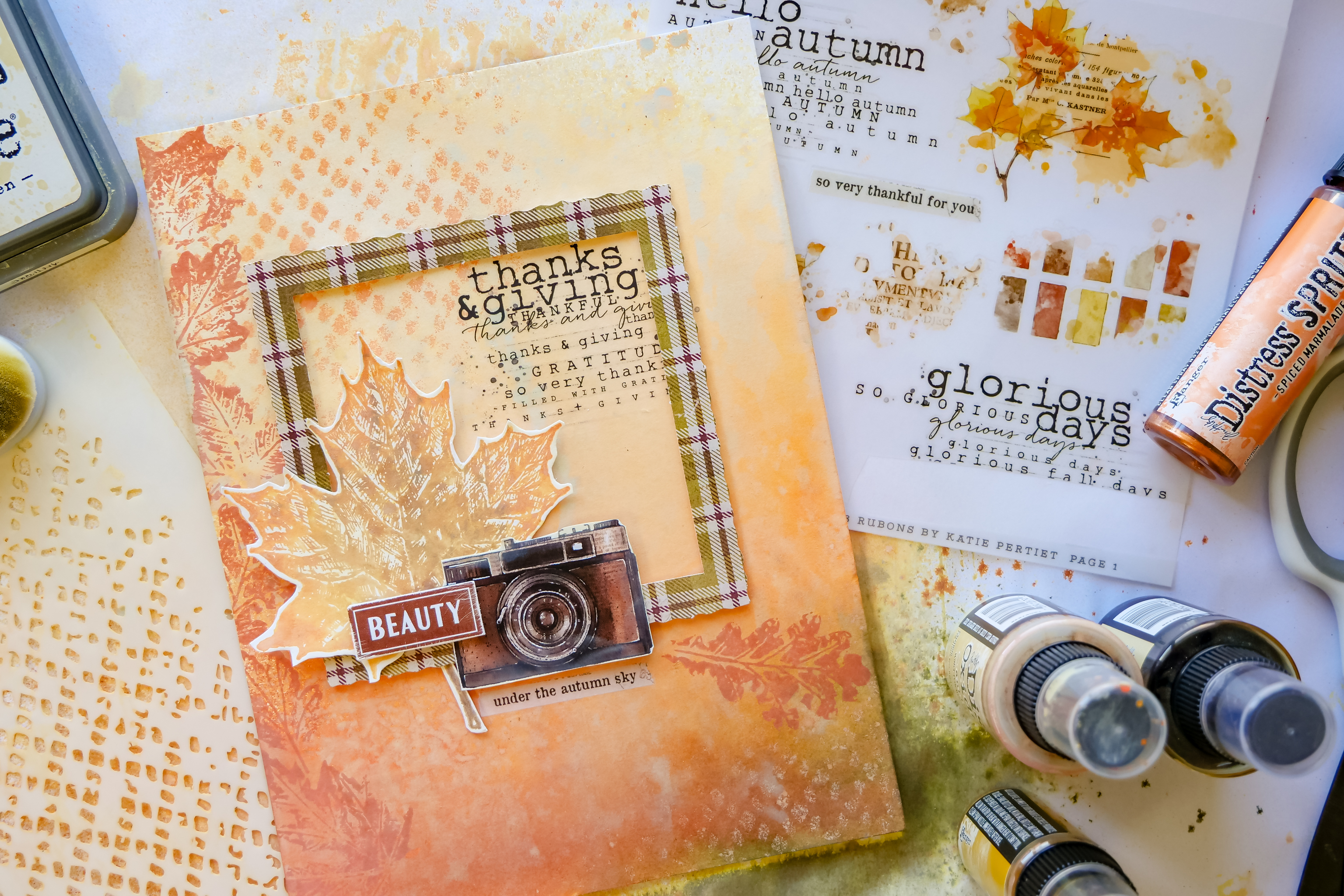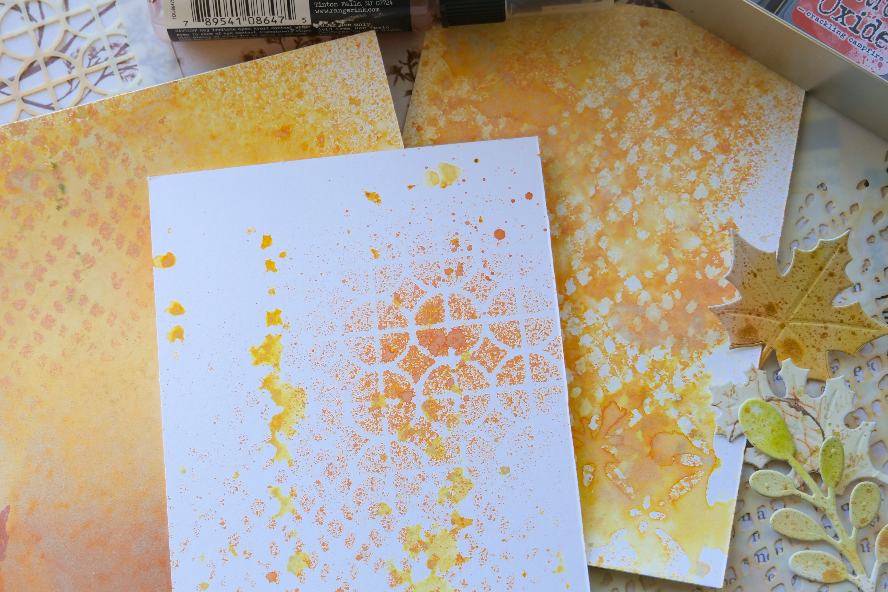 Spray a mix of Distress Stains Distress Oxide Spray on on 6x8 sheet