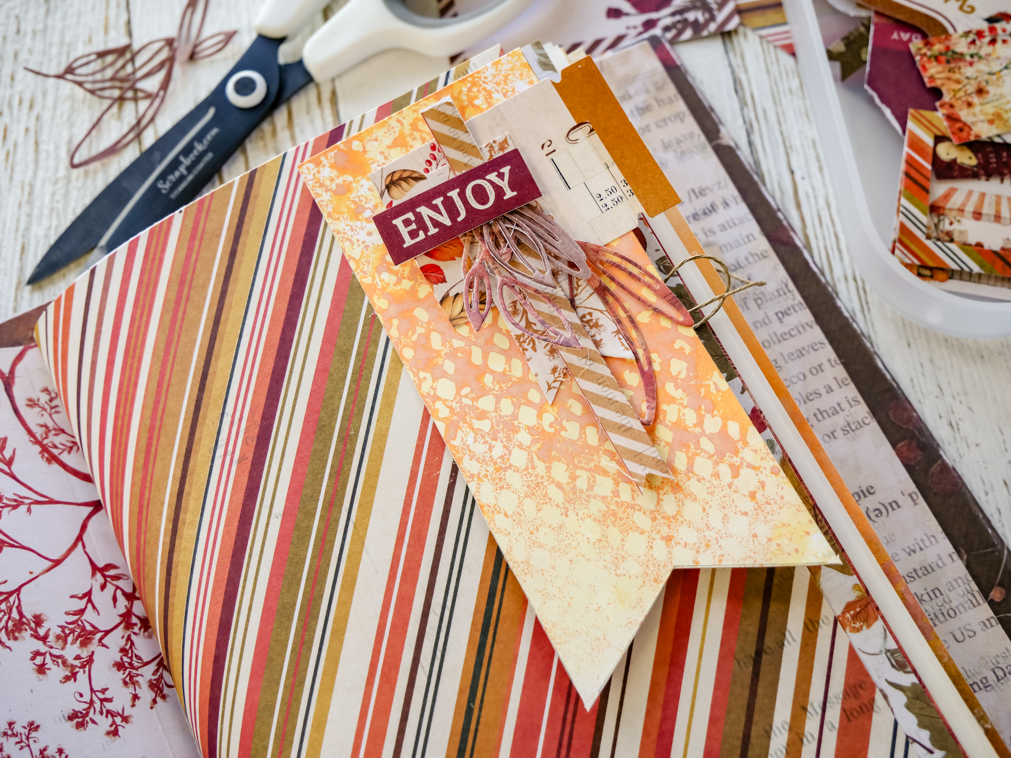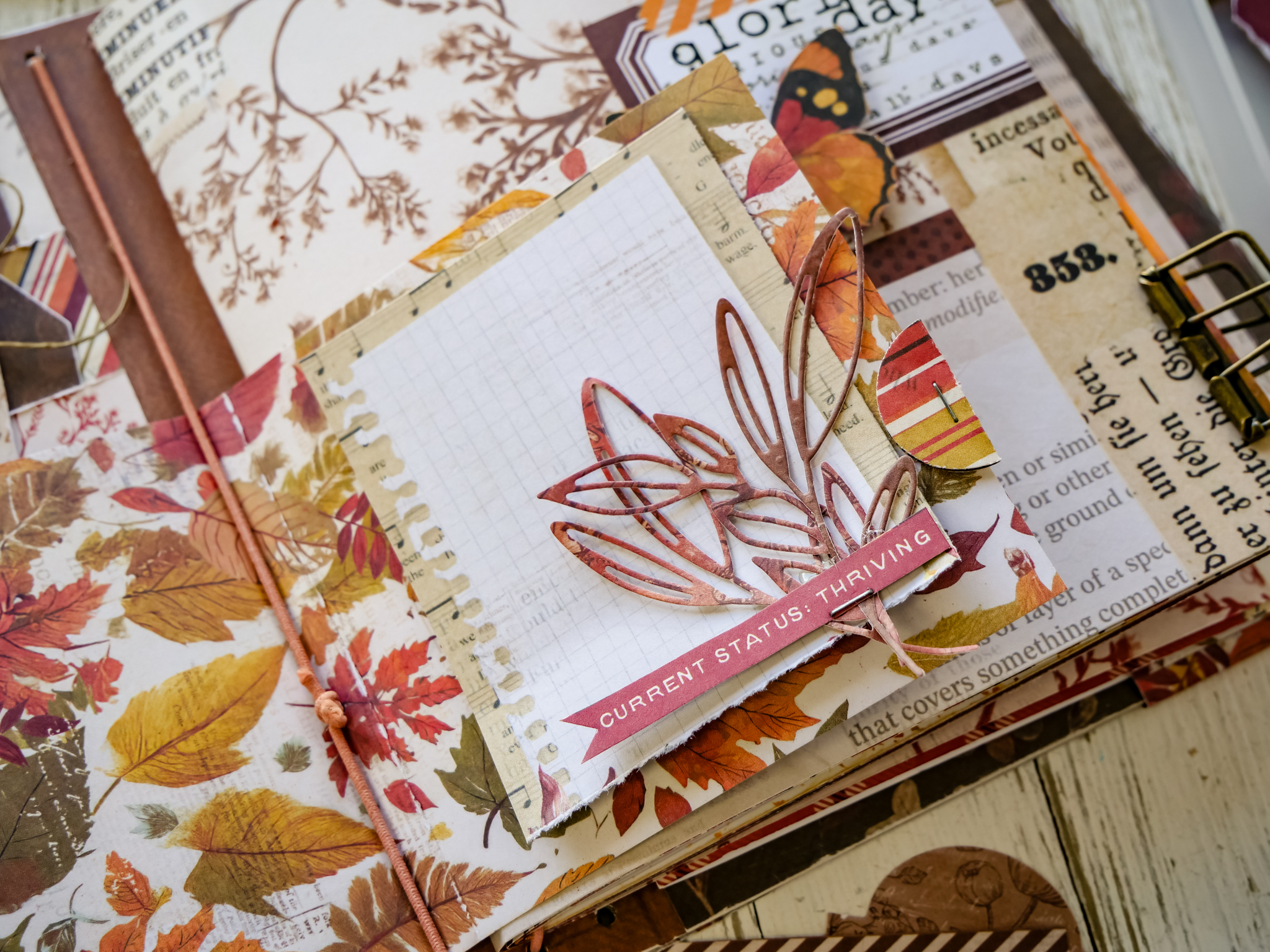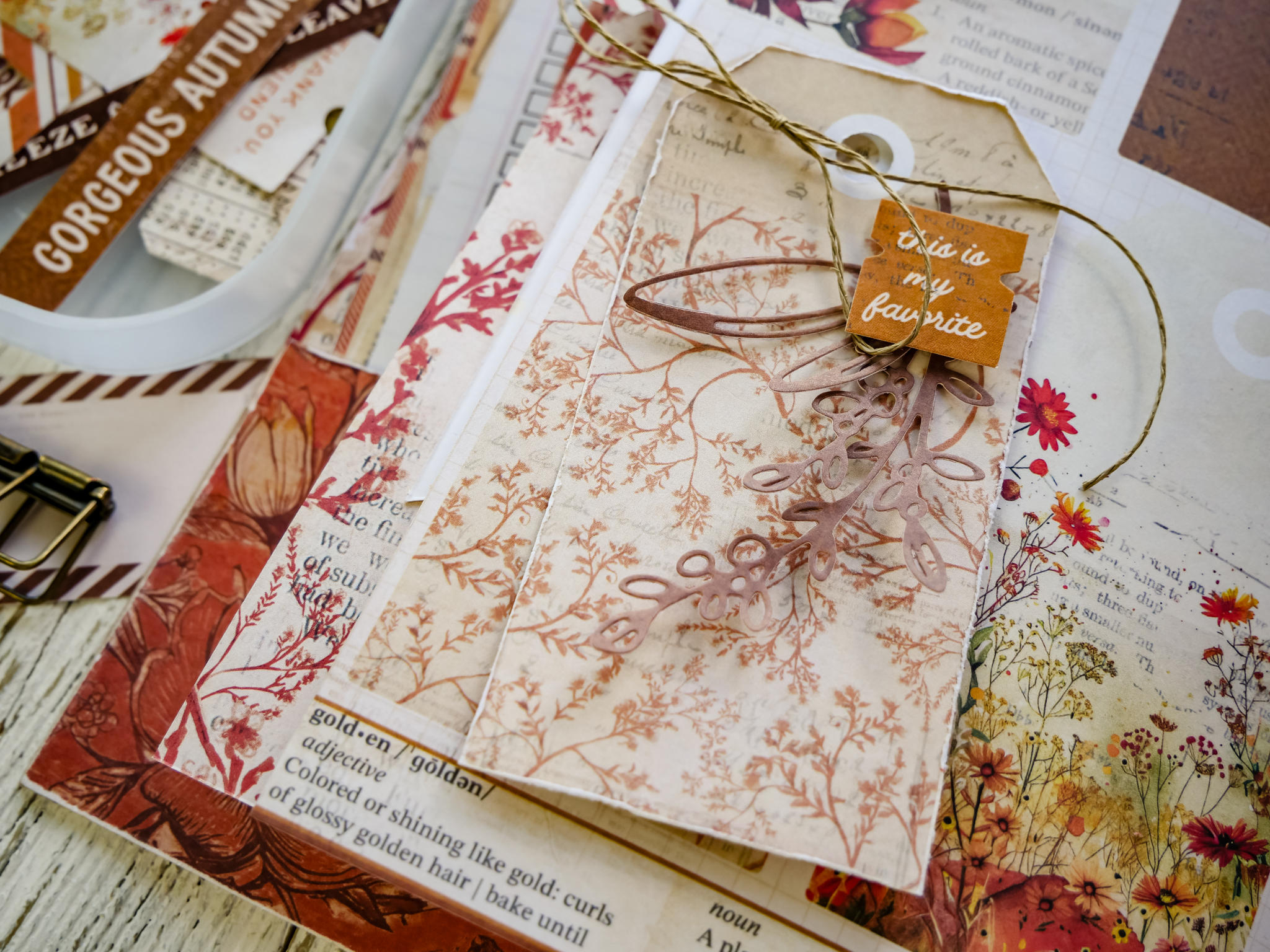 On it layer: ephemera ticket, ephemera notched tag, trimmed tag plus die cut leaves.