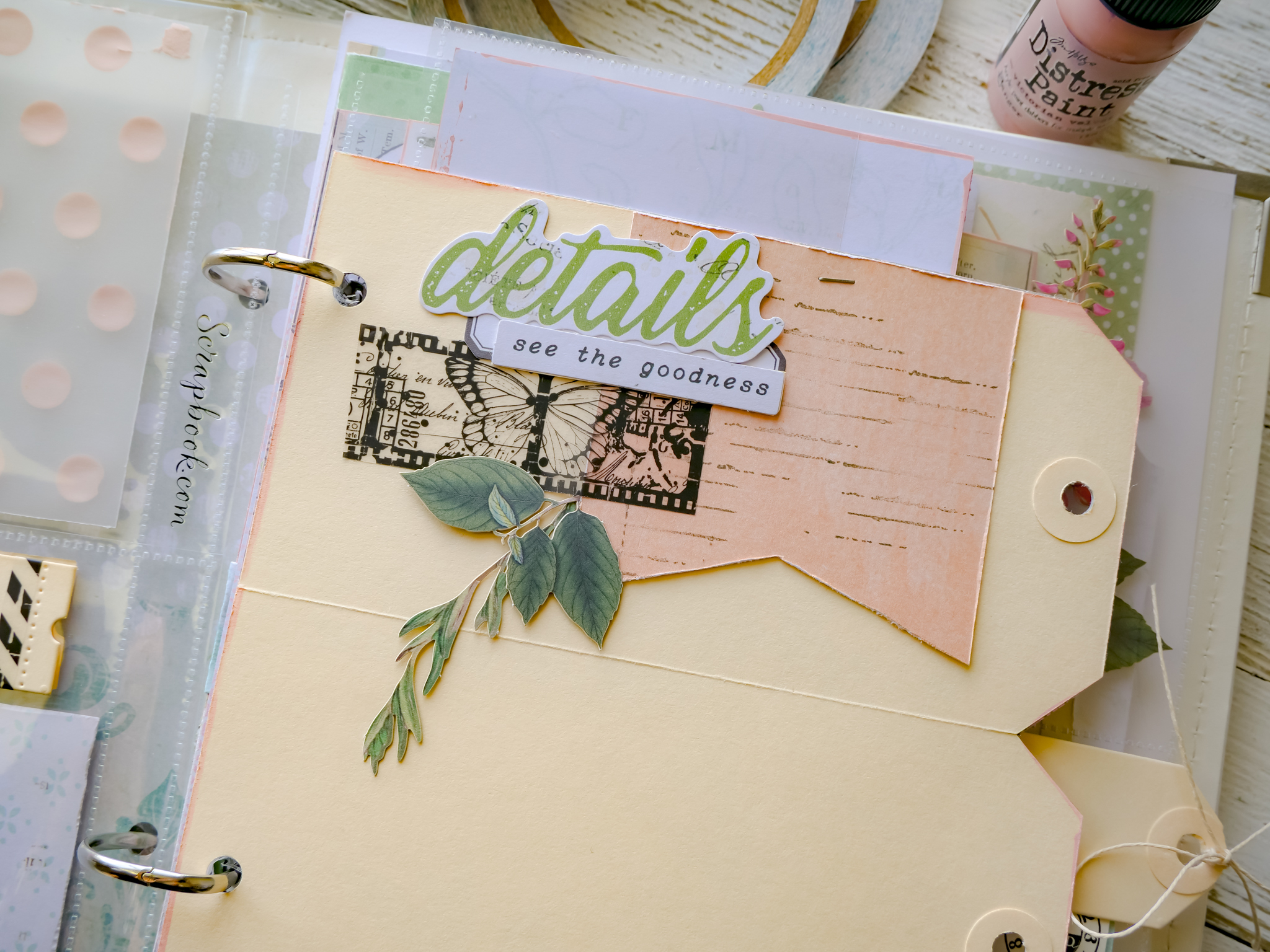 Lesson 5 is a unique page as it is built on two DIY tags that are crafted from a manila folder. The tags are attached to pattern paper so that they are parallel to one another. And then the patterned paper is trimmed so that it is then shaped like the two tags.