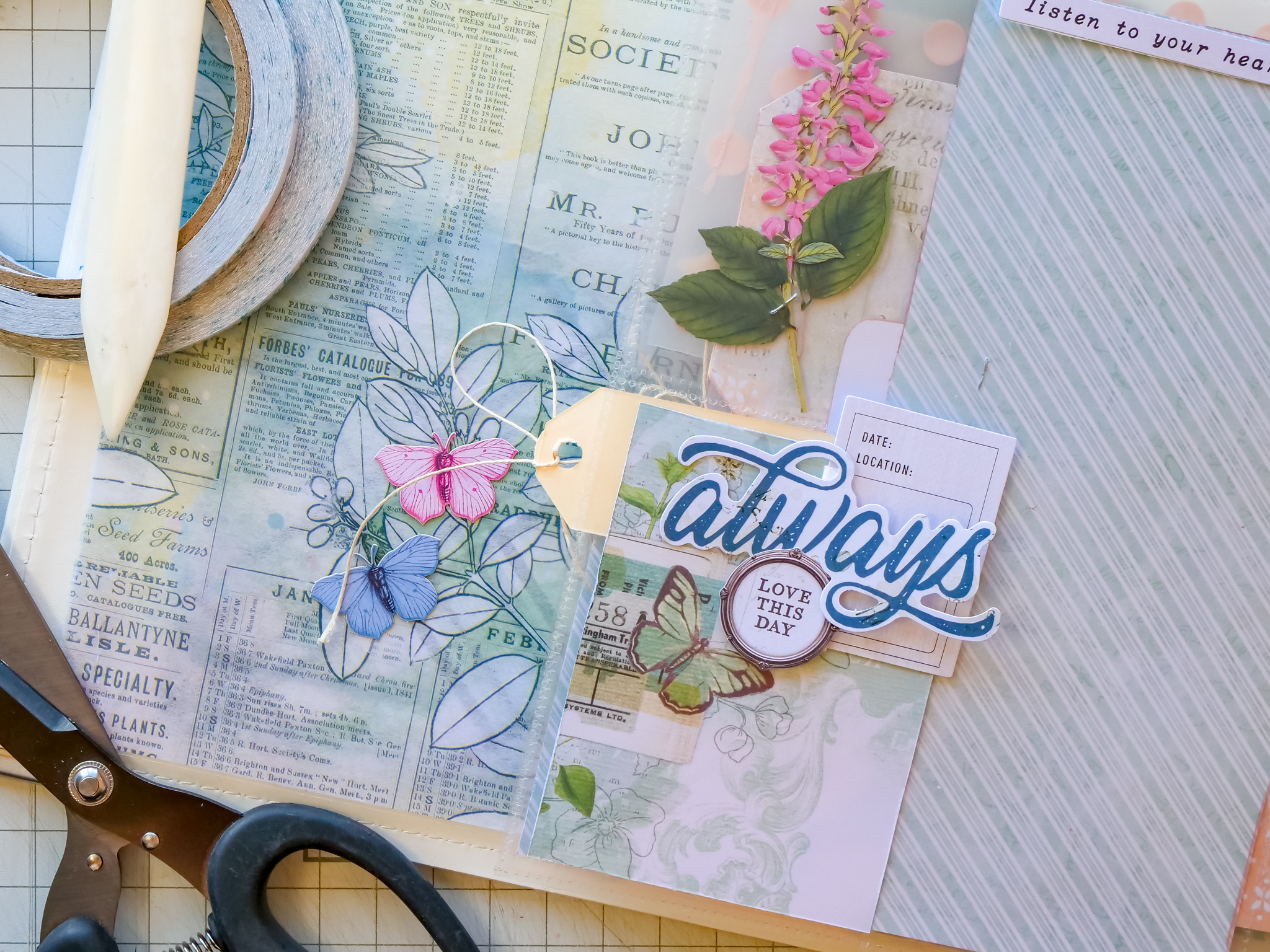 Lesson 6 is another pocket page that mostly builds on the outside of the pocket, with a few tuck ins here and there. To also include a pocket with floating botanicals. It's a fairly simply page but with a small little advanced technique at the end.