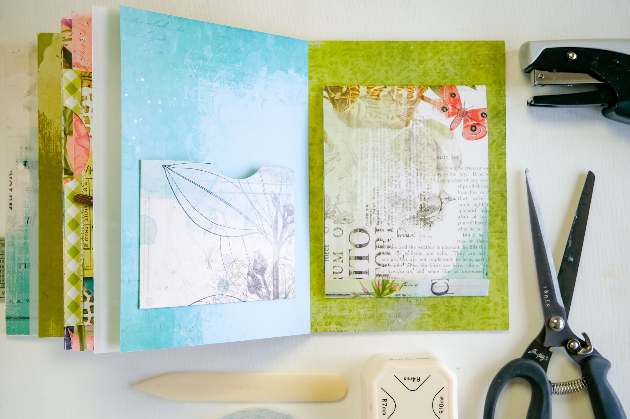 This lesson will complete this book. All the patterns will be inserted. Now to add some layers to the very back of the book on the inside cover. Nearly complete this paper crafted book will be a lovely inspiration for other books to come, as well as plenty of clusters and embellishing and techniques on the page.