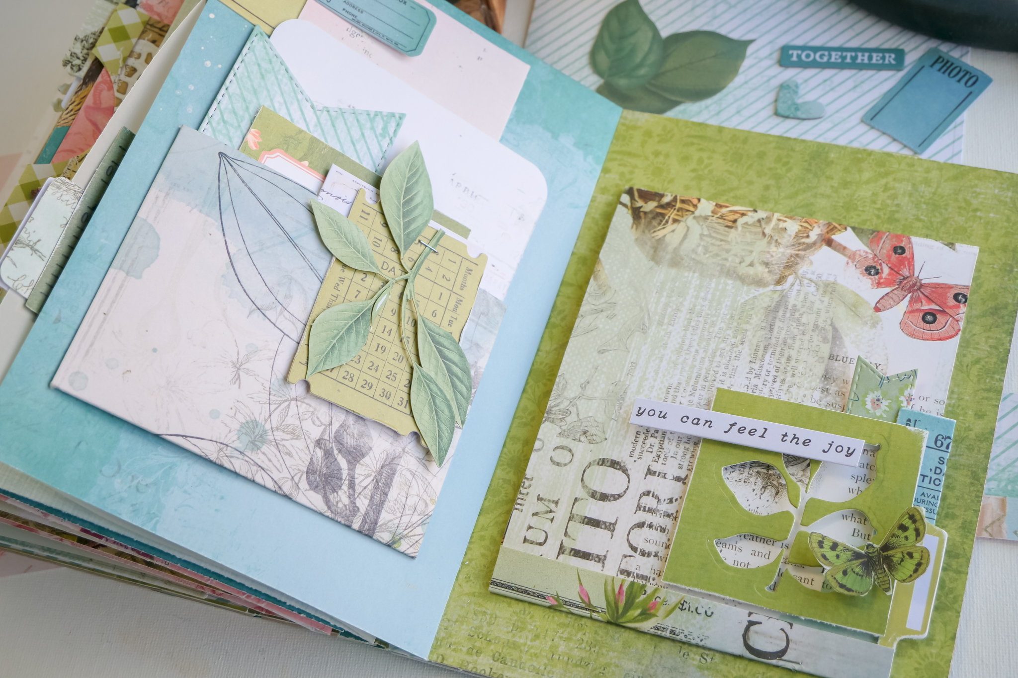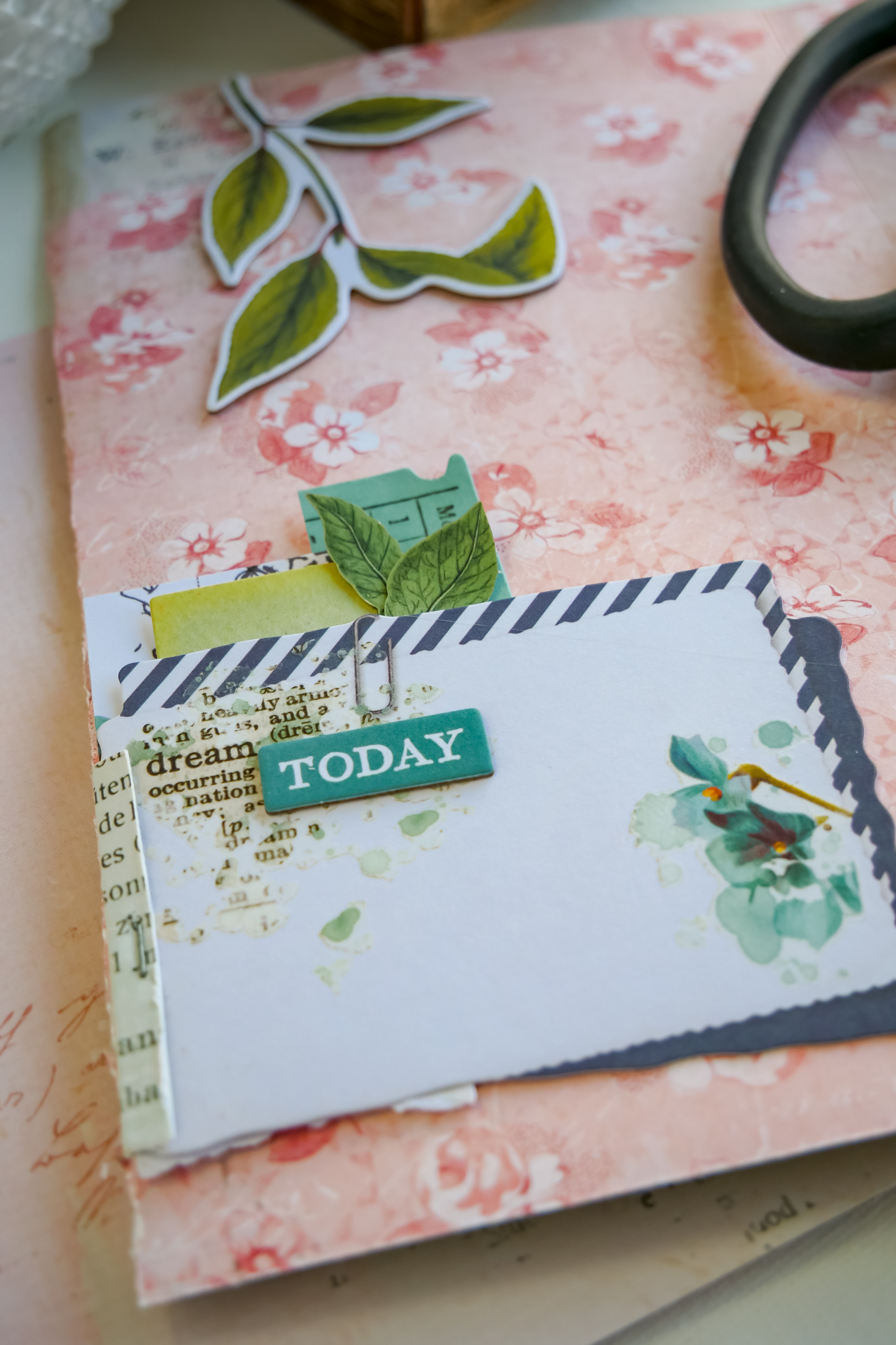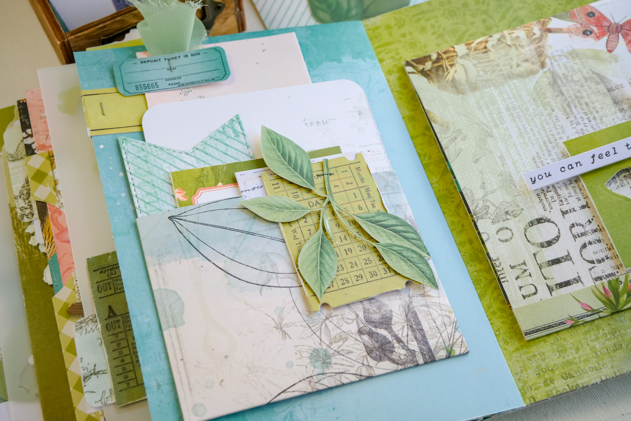 9. In the pocket facing the back cover, tuck in post card ephemera, cut apart journal cards, notched banners, stapled Stems, or whatever makes your heart happy. Journal your thoughts about your current creativity to add to this pocket too.