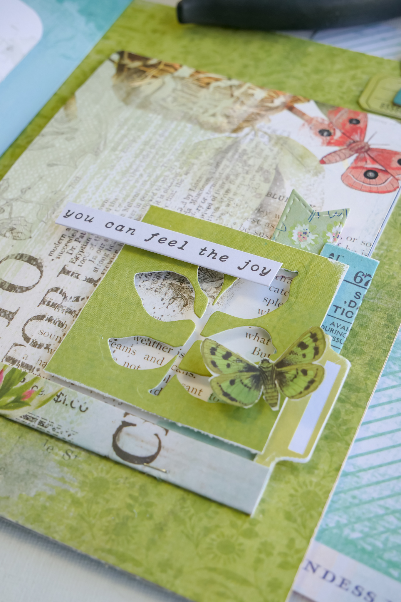 3. On the acetate cover page, pop on butterflies in a random fashion with foam adhesive. Back the page up with same if desired to cover the foam adhesive