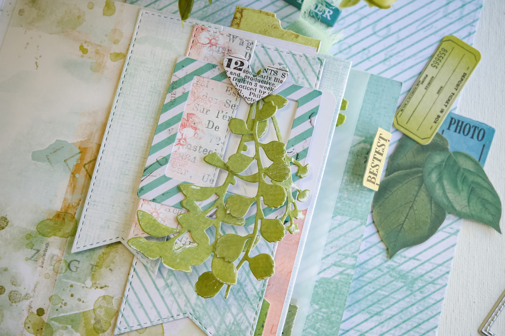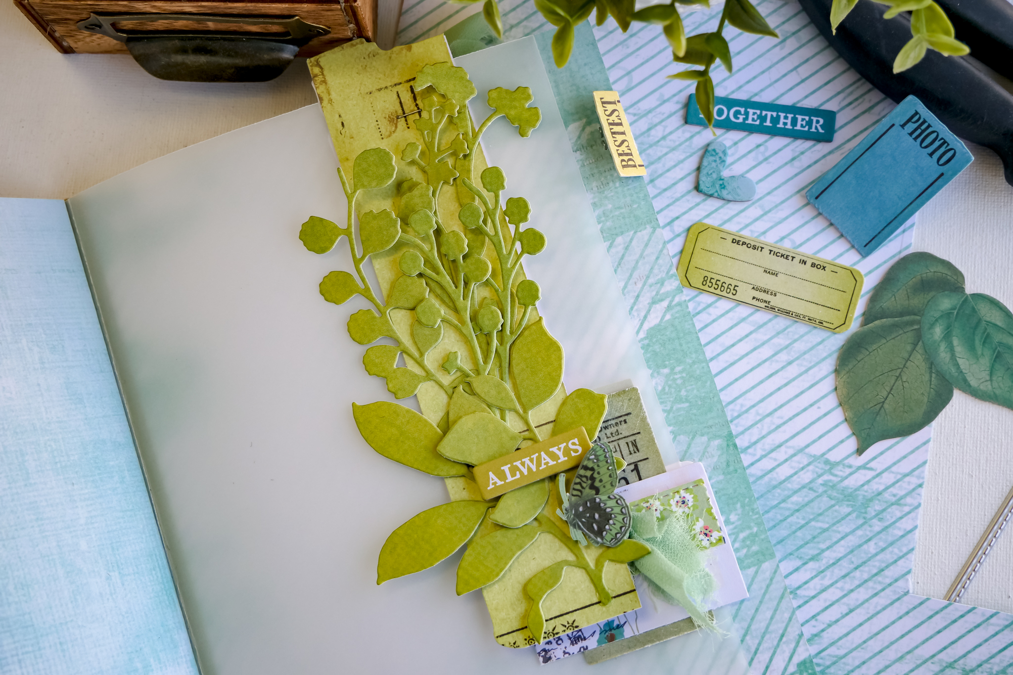 Using precut Stems, or cut now, create a trellis of cuts up the long ephemera piece on the front page.