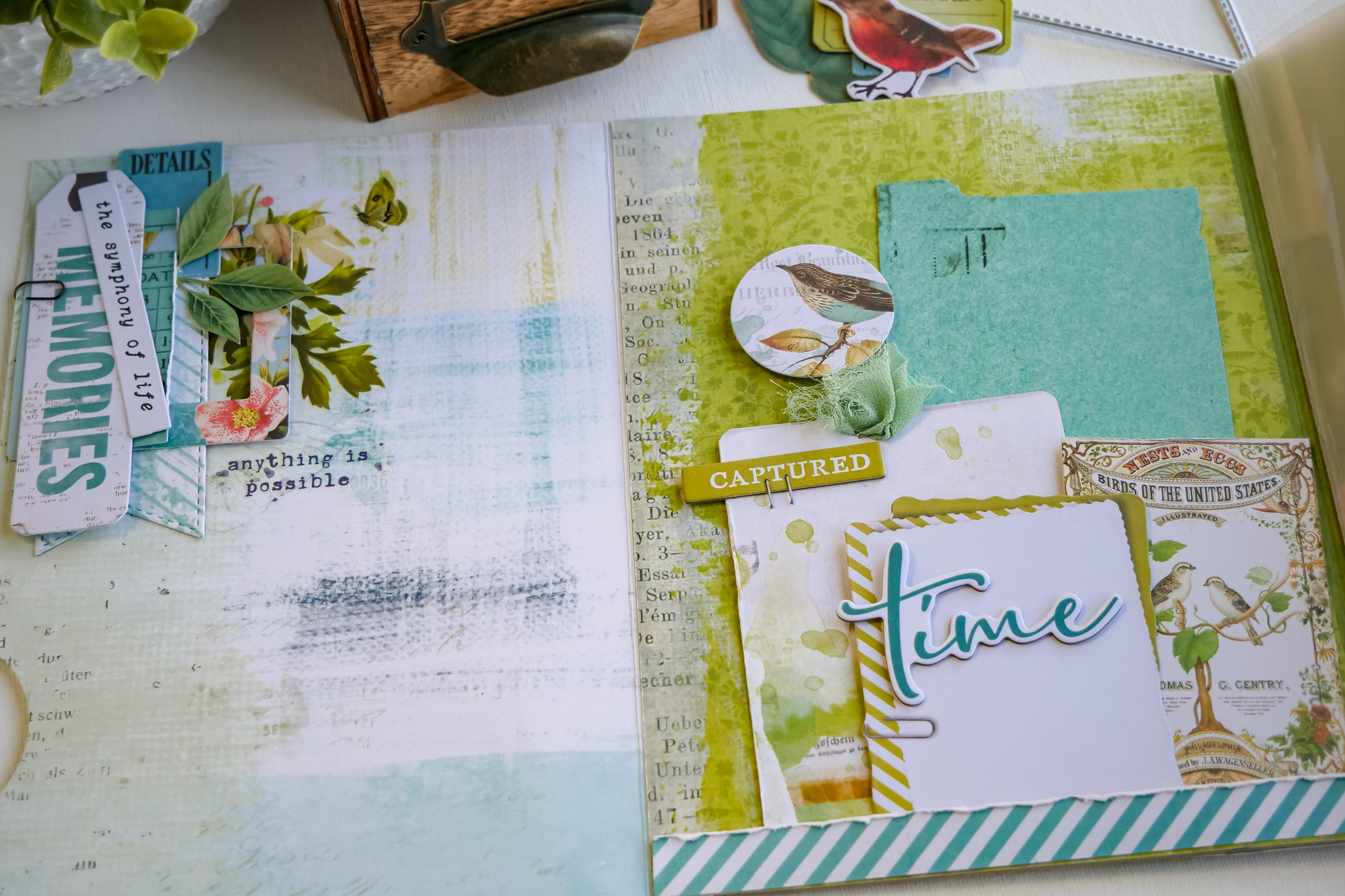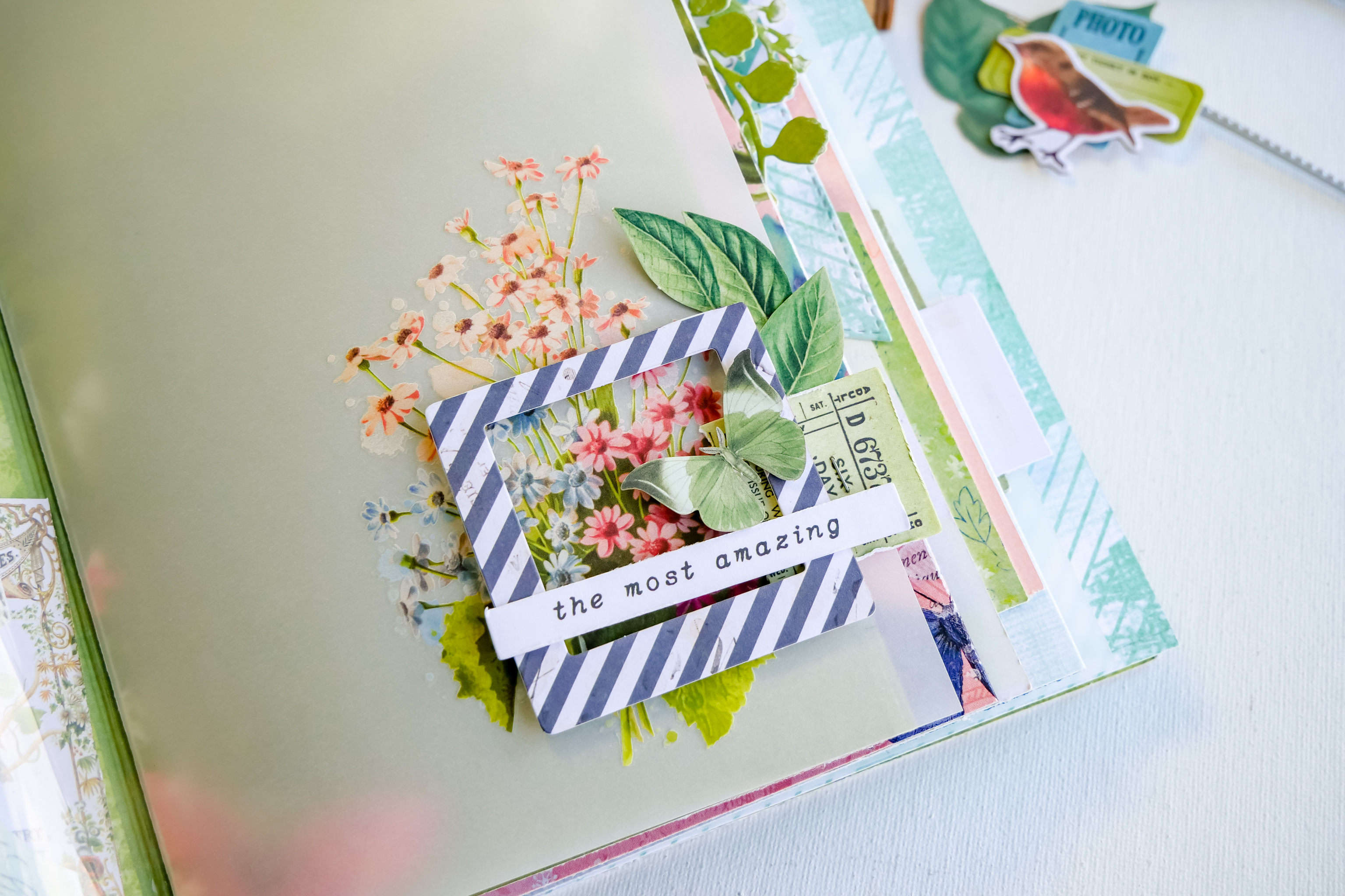 2. Open the flip page, add a rub on that will peek out from a layered cluster at the upper left had corner.
