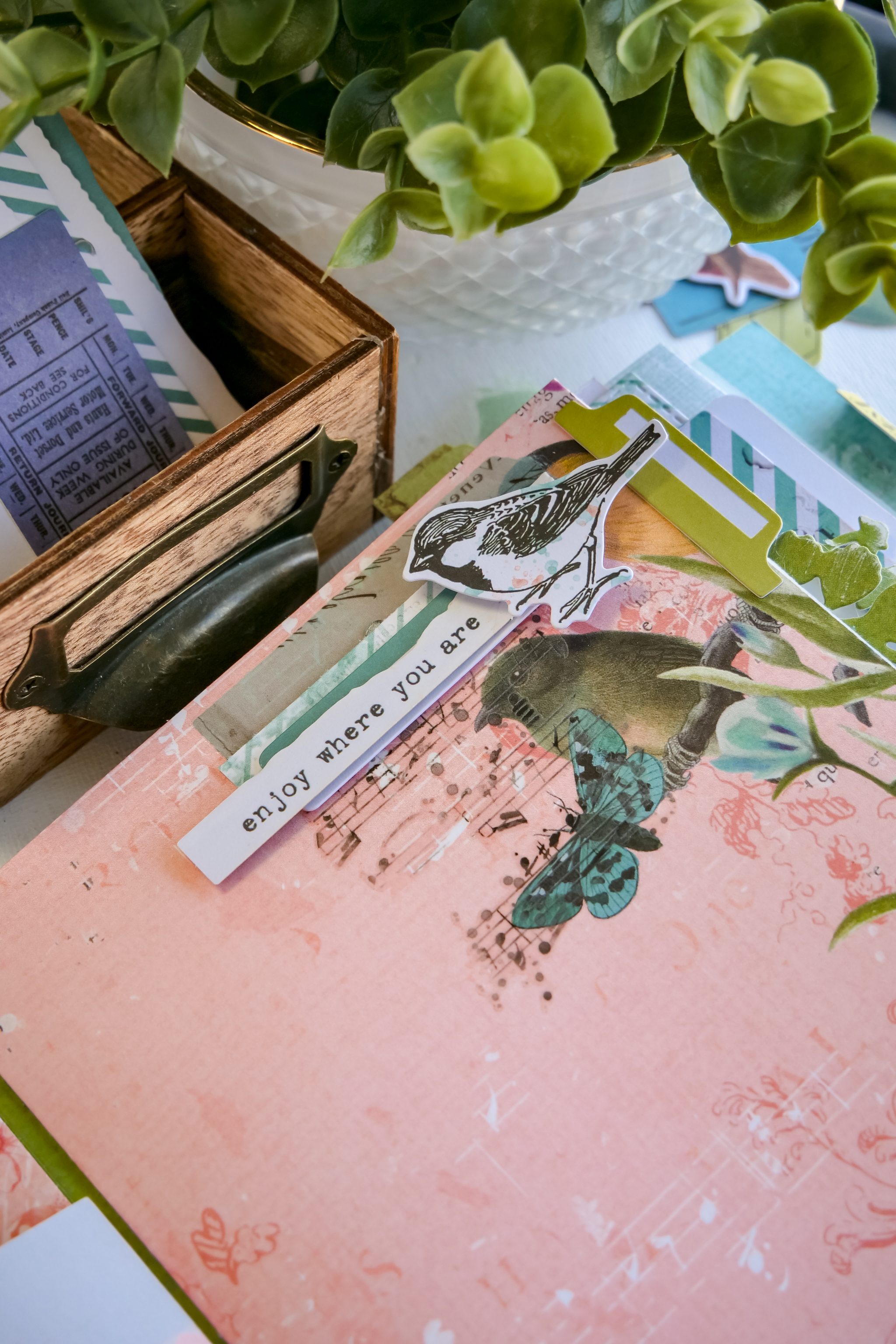 Gather a tag, postage, tab tag, frame, notched banner, or whatever, and clip to the page with paper clip, mini clothes pin, Tiny Attacher, or even glue all the pieces down with adhesive in the middle of each only. Maybe add sprig or two as well.