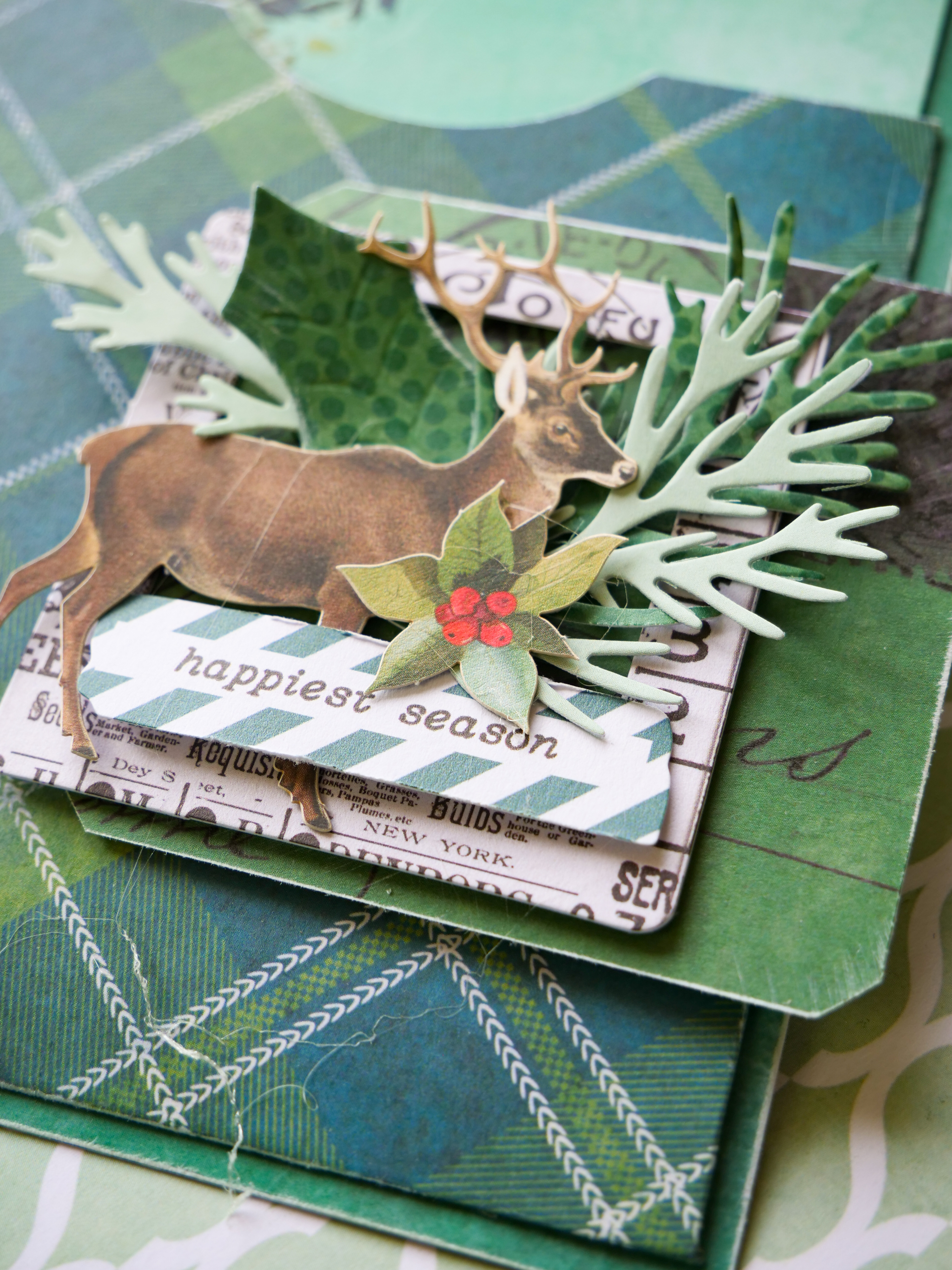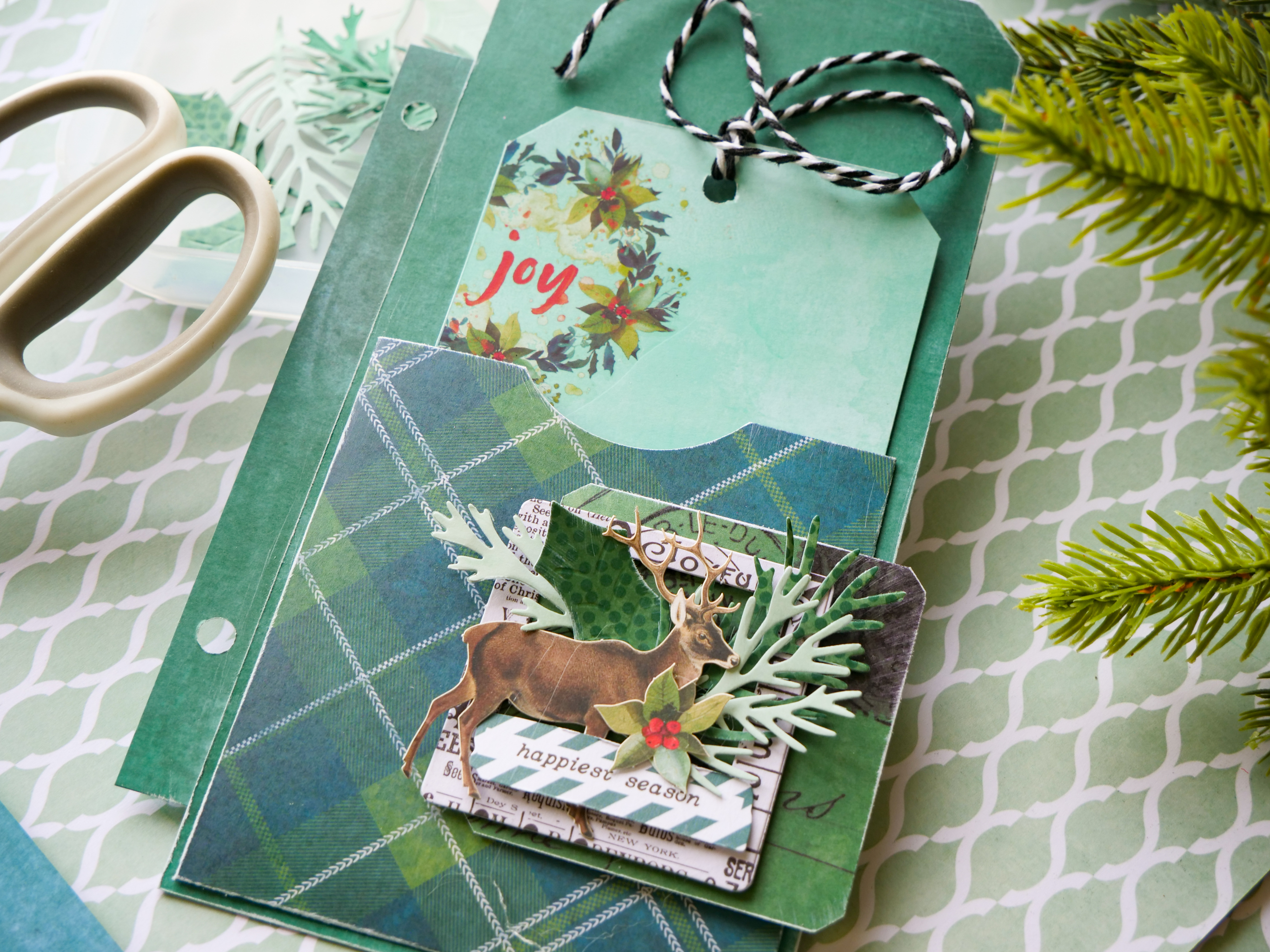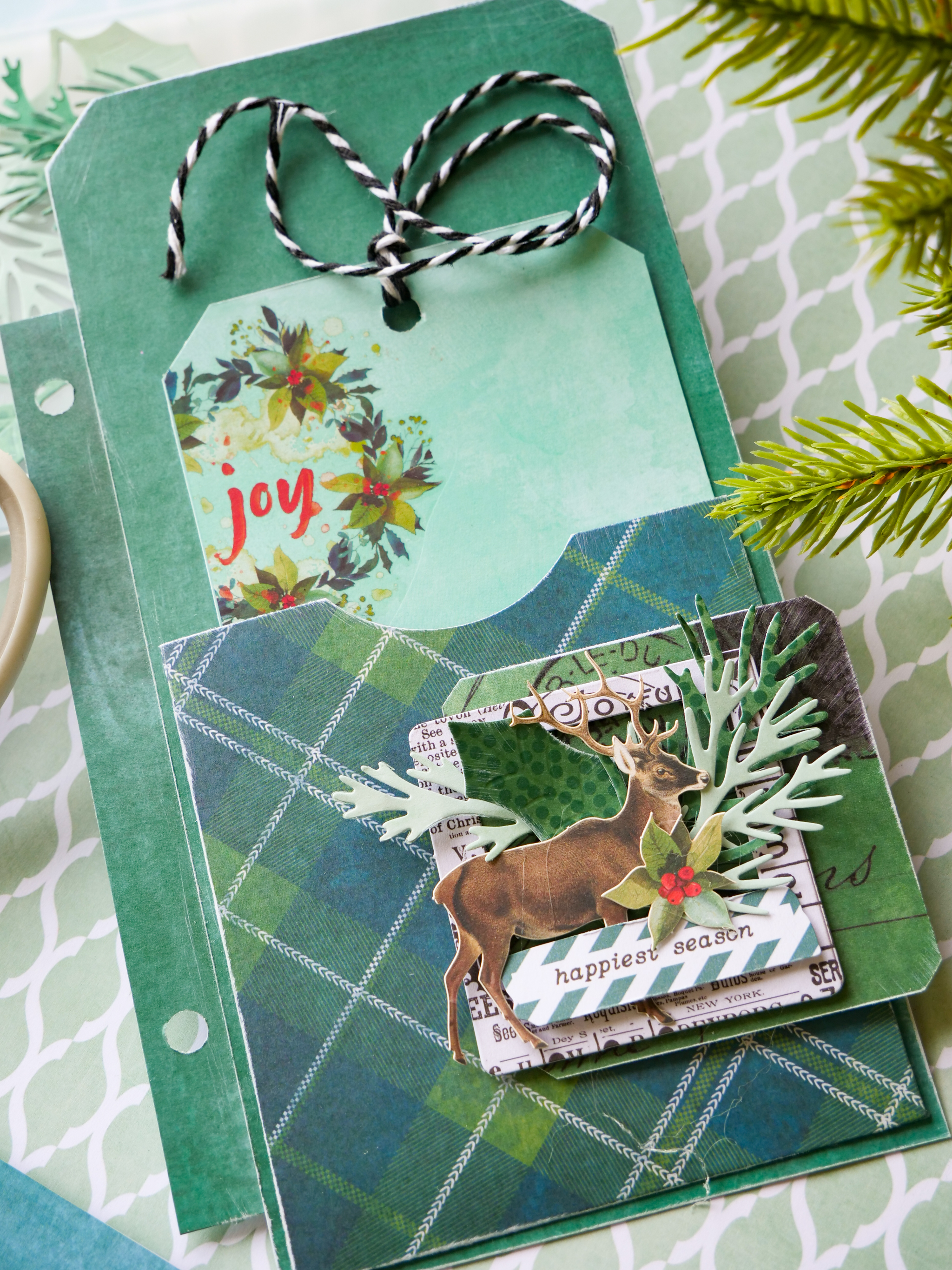 die cuts and sentiment, creating a festive embellished cluster to the front of the pocket.