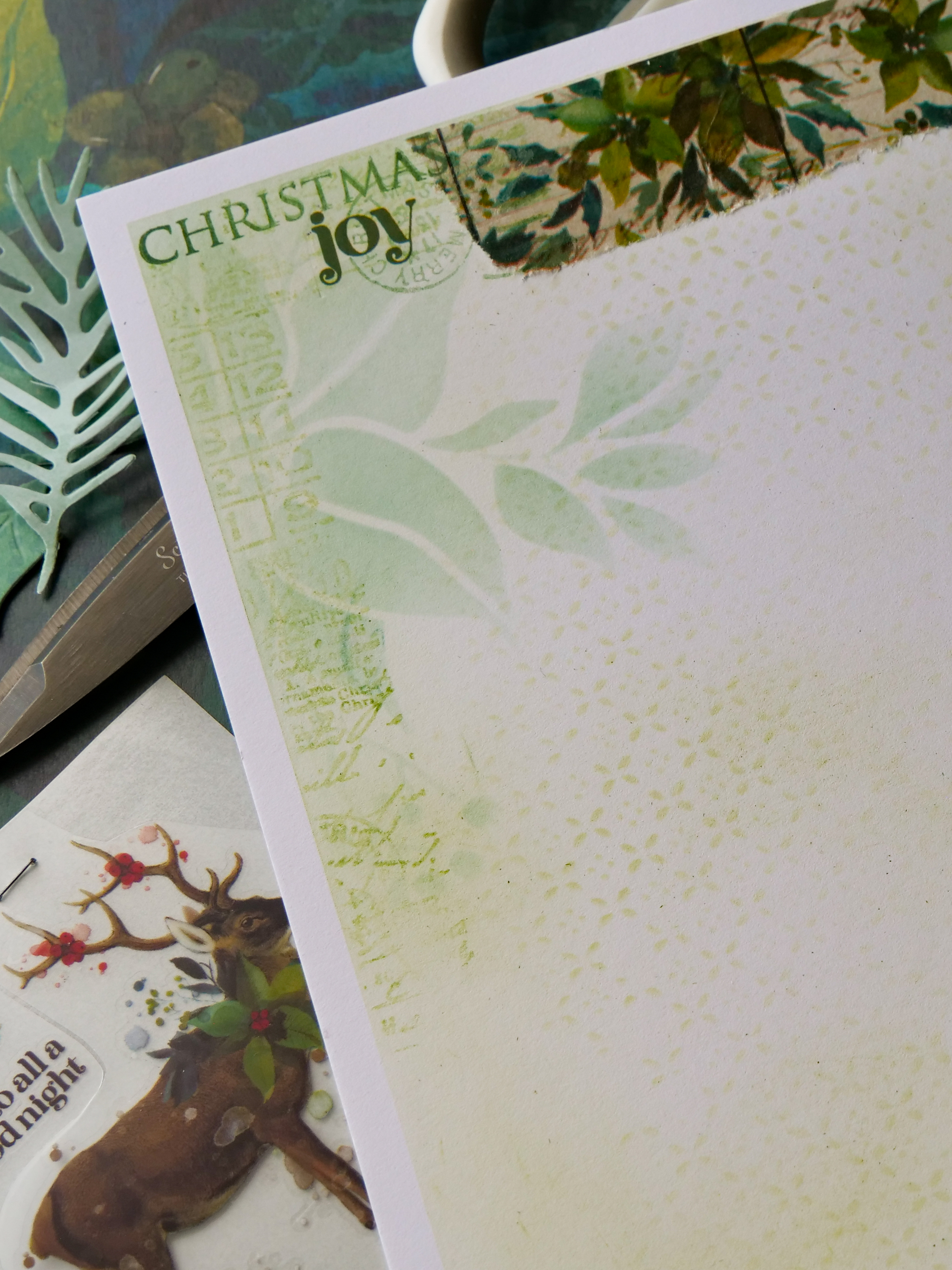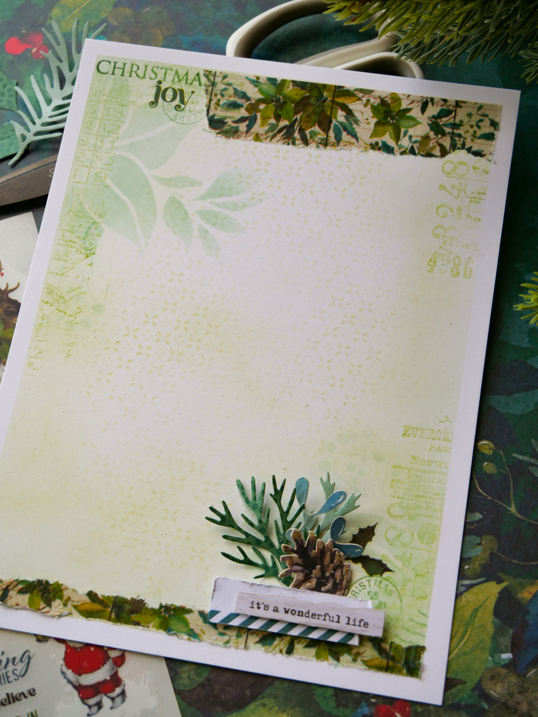 With Evergreen Bough, add inking to the corners, then stencil from the edges with the Seasonal Blooms Stencil.