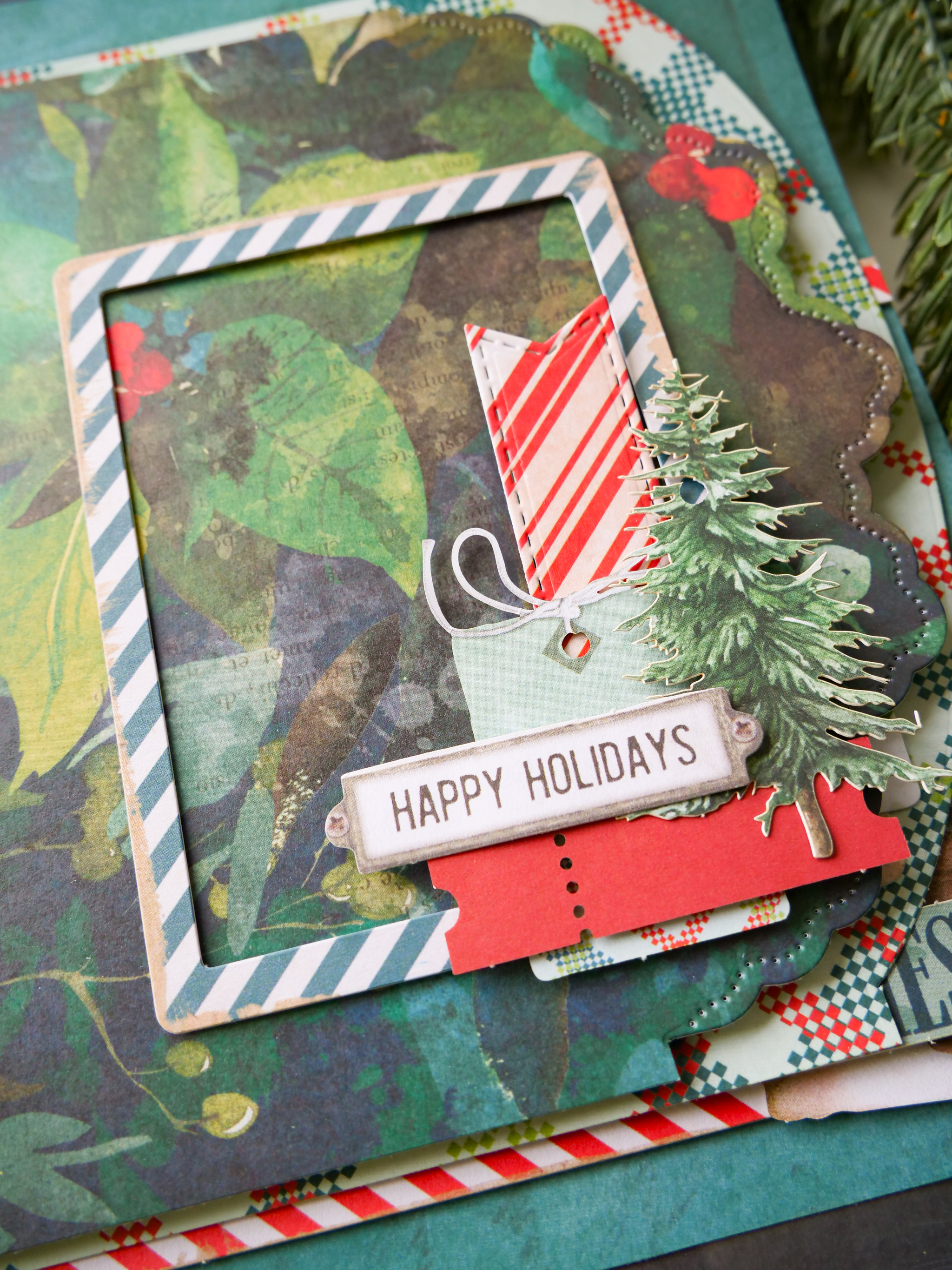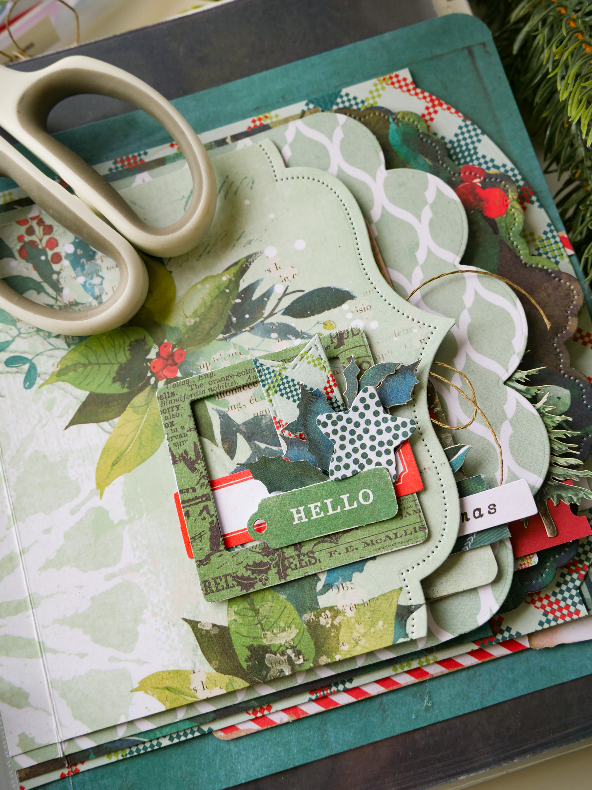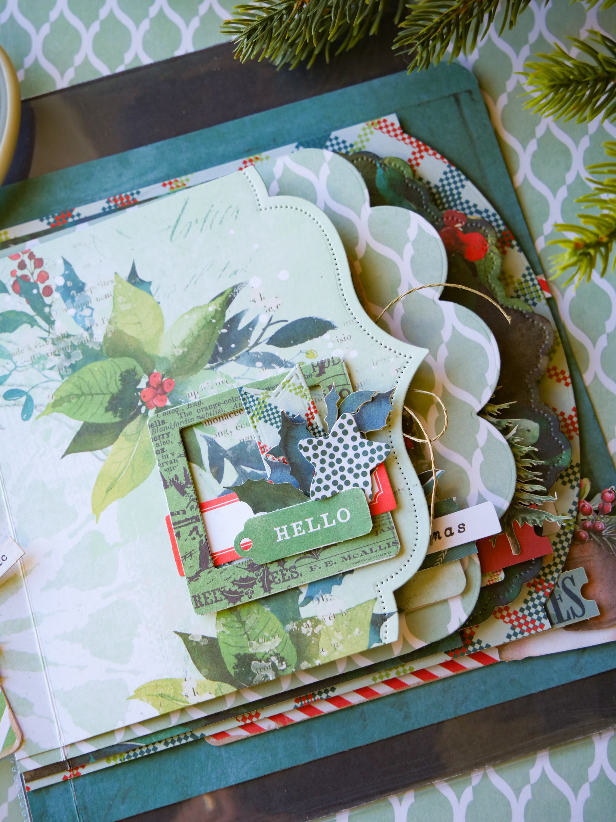 Gather and assemble: (see details with photos below) frame, label, sentiment, icon (star, tag, laser cut envelope, stamp) notched banner, botanical to create embellished clusters for each page.