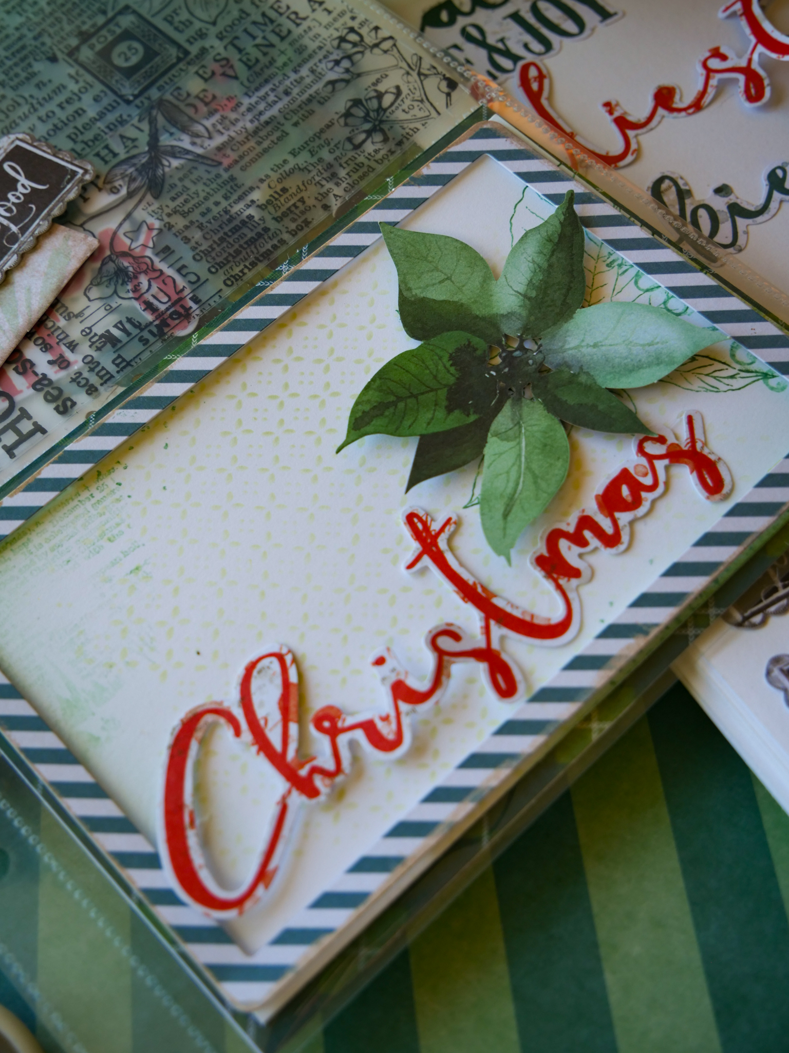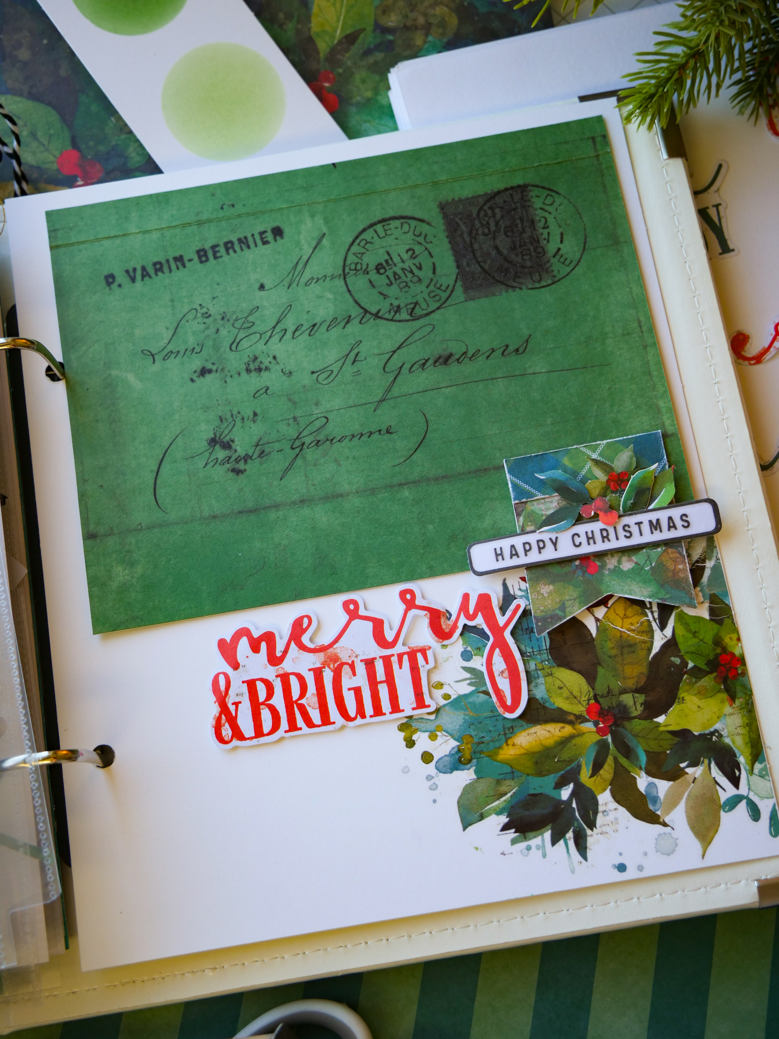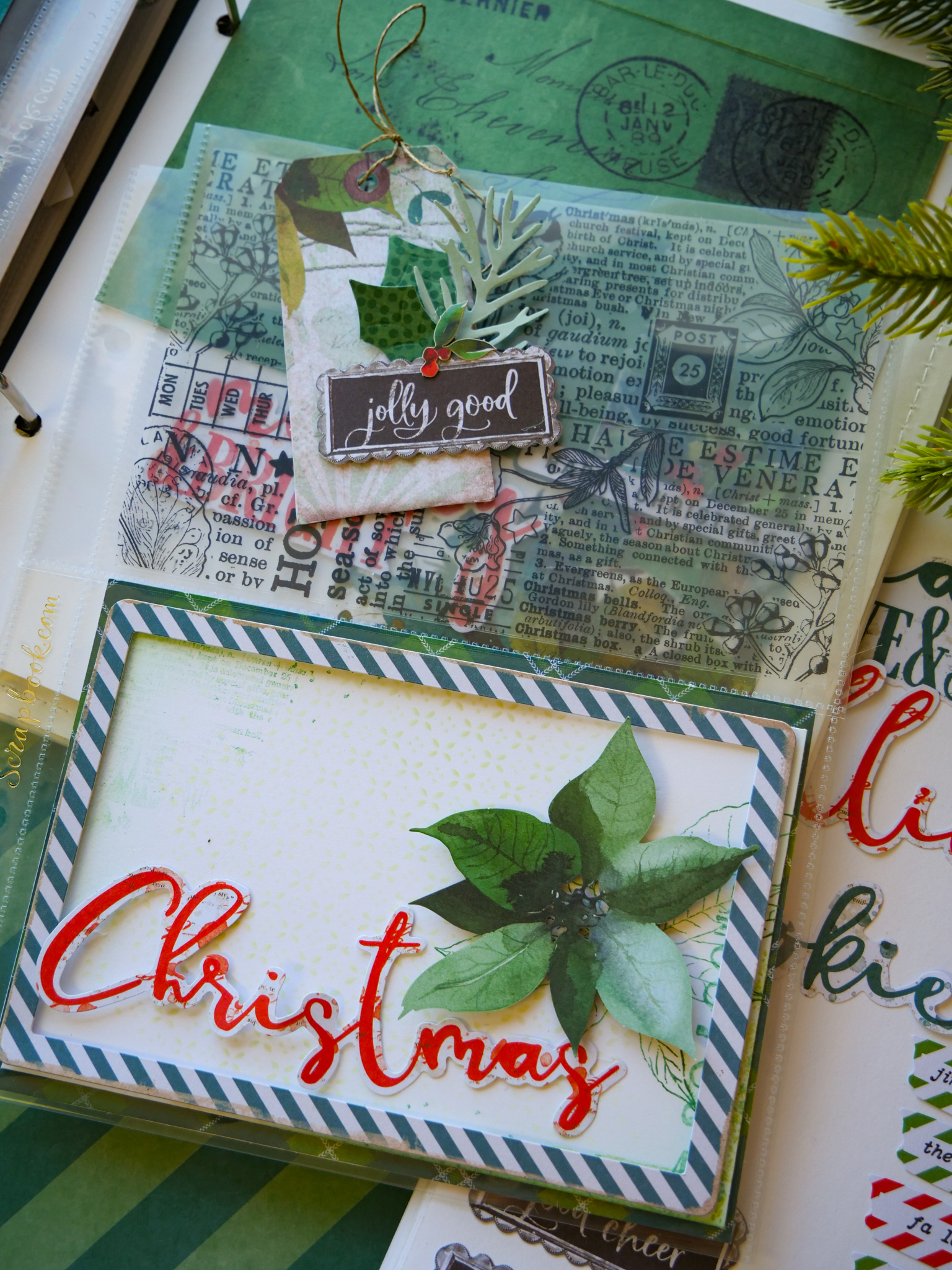 Trim acetate to fit the pocket. Adhere Season of Joy tape in two strips to the acetate. Slip inside the pocket.
